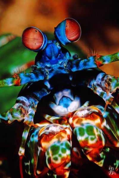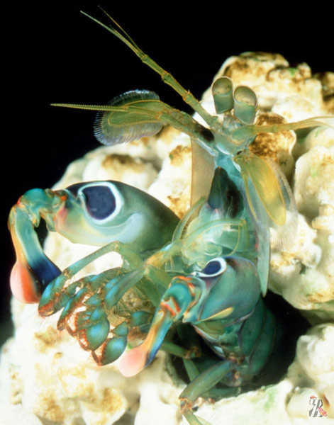 Рак-богомол роскошный Odontodactylus scyllarus известен не только своей яркой окраской, сделавшей его любимцем аквариумистов. У него есть одна знаменитая особенность: пара его передних ног представляет собой мощные булавообразные ударные орудия.Это грозное оружие нужно раку для охоты: креветка-богомол питается моллюсками, расшибая их раковины сверхмощными и сверхпрочными клещами. Рак может бить ими по раковинам моллюсков со скоростью пули, и его орудие не сломается.
