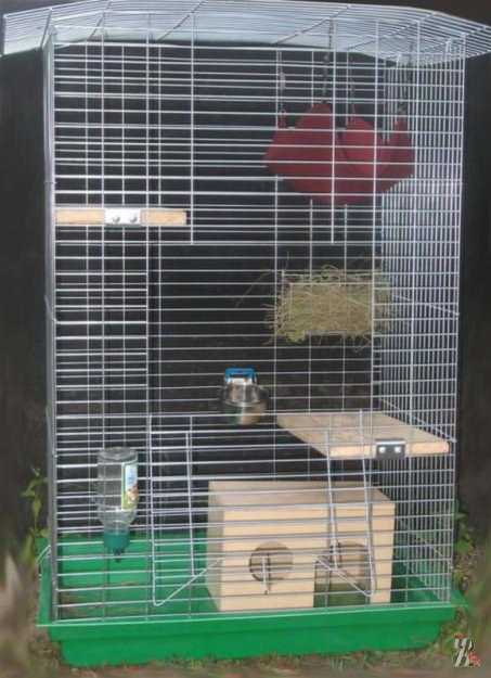 Клетку оборудуют кормушкой и поилкой. Кормушку и поилку подвешивают на передней стенке или на дверце клетки. Это делается для того, чтобы зверьки во время игр не переворачивали «столовые приборы» и не справляли в них нужду. Хорошо подходят кормушки для попугаев из металла или керамические с креплениями к клетке.