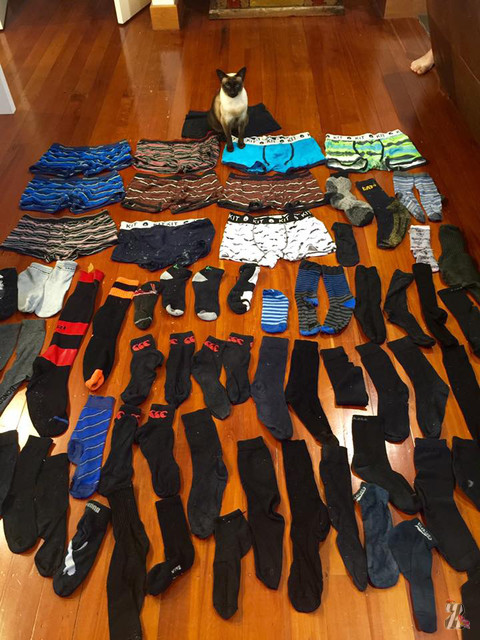 Как пишет газета «New Zealand Herald», за последние два месяца кошка тонкинской породы принесла в дом 11 пар трусов и более 50 пар носков.